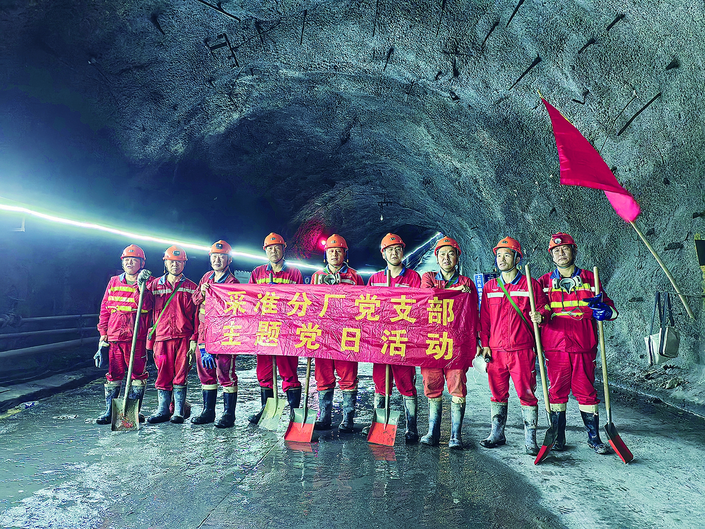 勇挑重担,激发奋进新活力。面对急难险重任务,党支部充分展现出强大的动员能力和引领作用。春节期间,我参与完成了井下-447米水平下矿仓衬板修复任务。施工前,党支部召开动员会和方案交底会,在重板和矿仓附近悬挂起党旗,它不仅是一面旗帜,更是激励全体党员勇往直前的精神象征。施工时,从搭设矿仓保护盘到起吊拖运衬板,每一个环节大家都全神贯注、认真对待。工作间隙,大家互相交流施工细节,分享以往积累的修复经验。在全体人员的共同努力下,顺利完成2个下矿仓的修复任务。面对即将到来的难度更大的上矿仓修复任务,大家依旧信心十足,充满了迎接挑战的勇气和决心。