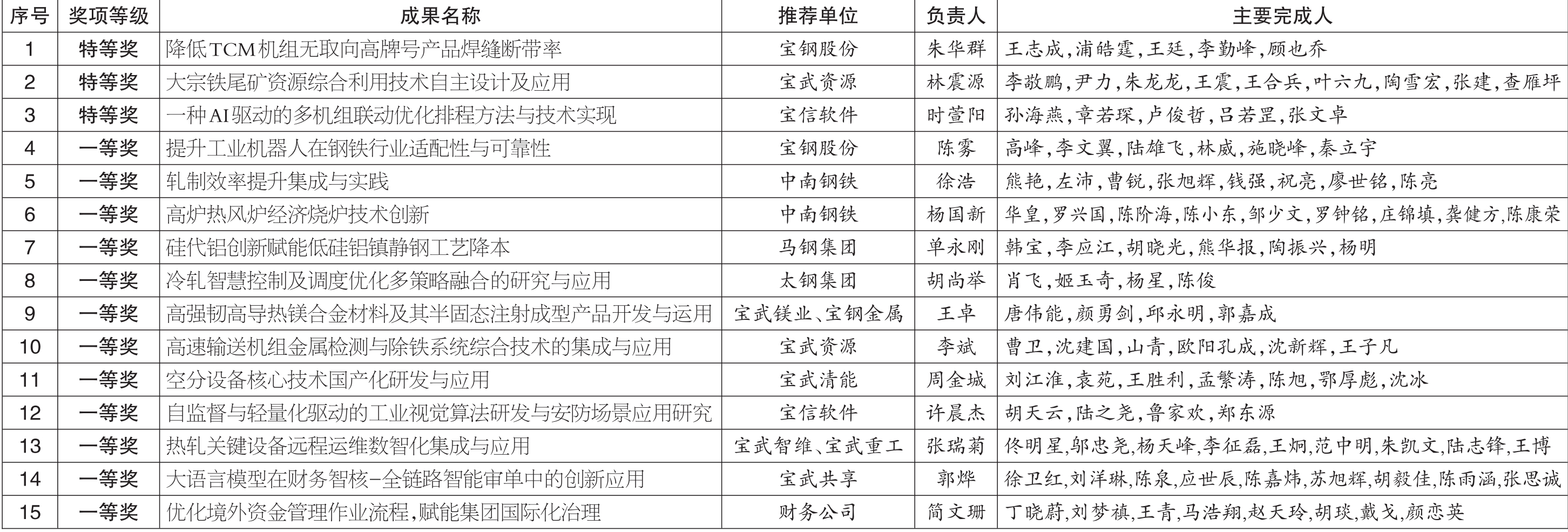 经各单位推荐、专业评审、综合评审,已产生第五届“中国宝武优秀岗位创新成果奖”特等奖3项、一等奖12项。现将获得特等奖、一等奖的成果相关信息予以公示(所有获奖成果同步在推荐单位公示)。