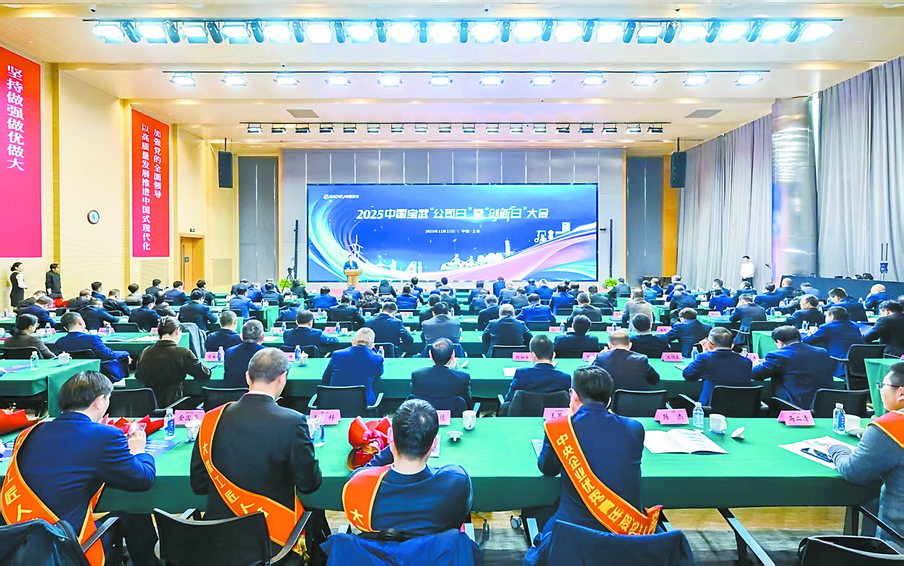 会场内,气氛庄重热烈。刚参加完升旗仪式的百余名代表步入场内,认真观看视频《2025年宝武十大新闻》。主席台侧,两幅鲜红标语在灯光映照下格外醒目--“加强党的全面领导,以高质量发展推进中国式现代化”“坚持做强做优做大,全力以赴加快建设世界一流企业”。字字铿锵,激扬起全场拼搏奋进的斗志。