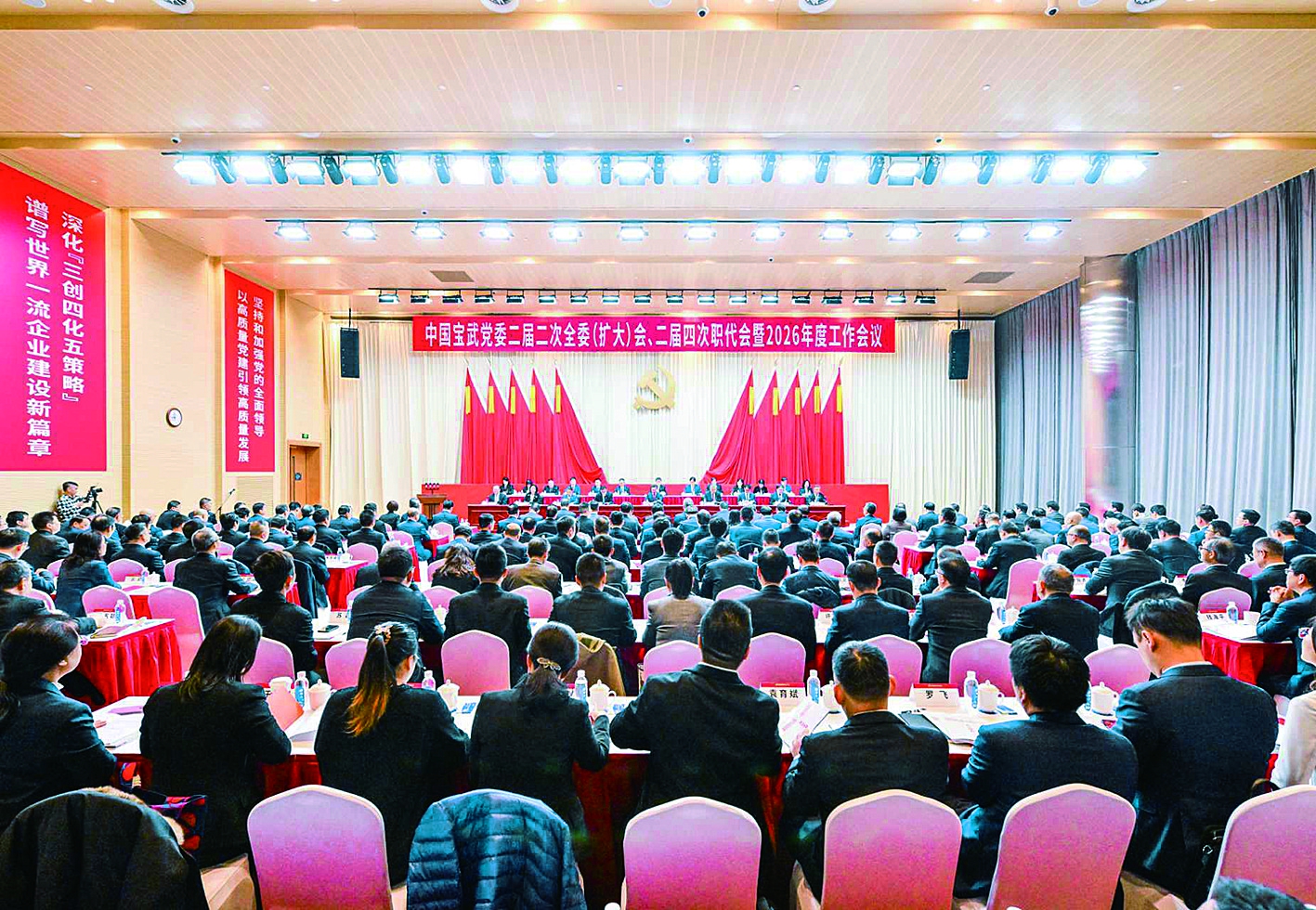 本报讯1月15日至16日,中国宝武党委二届二次全委(扩大)会、二届四次职代会暨2026年度工作会议在宝武大厦召开。会议审议通过了宝武党委二届二次全委(扩大)会决议、集团公司二届四次职代会决议。会议号召,宝武各级党组织和全体共产党员、广大干部职工要更加紧密地团结在以习近平同志为核心的党中央周围,坚持以习近平新时代中国特色社会主义思想为指导,深刻领悟“两个确立”的决定性意义、增强“四个意识”、坚定“四个自信”、做到“两个维护”,坚定信心,鼓足干劲,全力以赴完成2026年各项目标任务,确保“十五五”开好局、起好步,以宝武高质量发展创新实践为全面推进强国建设、民族复兴伟业作出新的更大贡献!宝武党委书记、董事长胡望明,宝武总经理、党委副书记侯安贵出席会议。