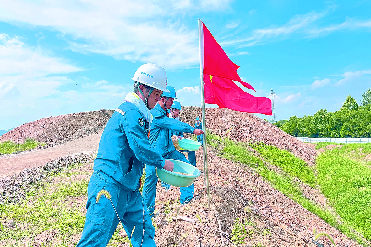 在矿山生态修复过程中,传统的苫盖材料容易老化、产生二次污染,而在此次生态修复活动中,项目团队大胆采用“高羊茅+狗牙根”混合草种与可降解玉米纤维滤网相结合的先进技术,对矿山边坡进行“生态苫盖”,促进矿山土壤的生态修复。据测算,这一创新举措的固土抑尘效果将比传统方式提升40%。