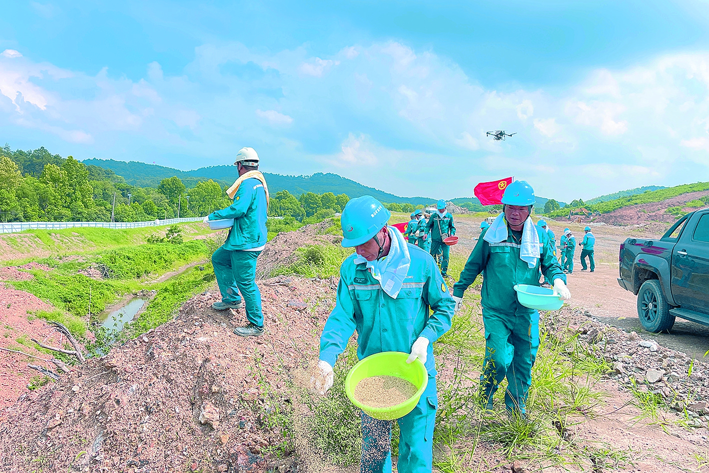 而在坡面区域,党员们充分发挥先锋模范作用,采用“人工+机械协同作业”模式,在坡面上灵活进行草籽补播和滤网铺设作业,确保生态修复工作无死角、全覆盖。