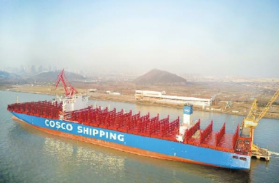 这艘2 0 0 0 0 标准箱级集装箱船命名为“C O S C O S H I P P I N G A R I E S”,由南通中远川崎为中远海运建造,船长4 0 0米,型宽5 8 .6 米,型深3 0 .7 米。作为新一代超大型集装箱船,该船搭载了智能船舶能效系统,具有油耗低、装箱量大、智能化程度高、适港性强等特点。