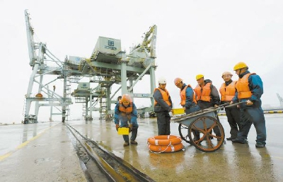 图为员工正在对港机防风设施做最后的加固和检查。 记者张 勇通讯员袁一鸣摄影报道