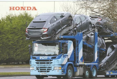 图为在英国斯温登,一辆满载汽车的运输车驶离本田汽车工厂。