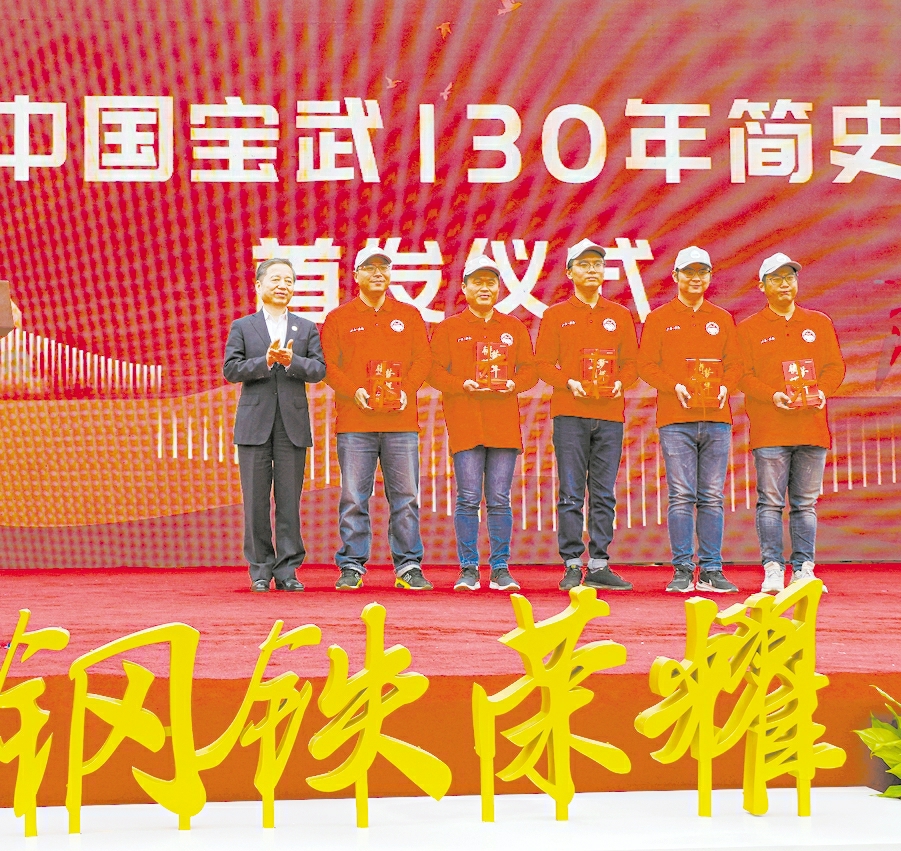 10月26日下午,《中国宝武130年简史》首发仪式在“重走钢铁长征路”宁马片区活动现场举行,中国宝武党委书记、董事长陈德荣向马钢青年员工赠书(右图)。