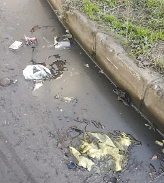 纬三路附近,路旁的污水上漂浮着垃圾,草坪上有丢弃的饮料瓶。