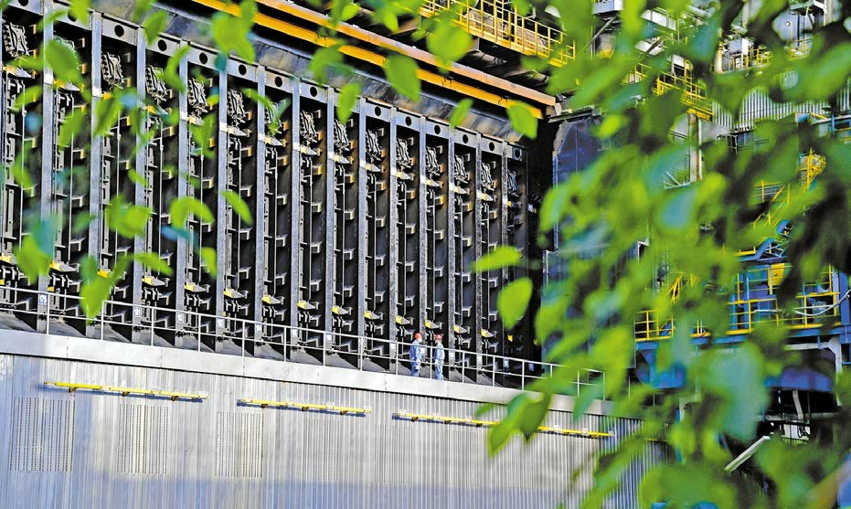 太钢集团焦化厂通过严格落实环保责任体系,实施焦炉设备技术改造,优化关键工艺参数,强化点检定修,持续推进焦炉炉体基础养护,确保环保设施100%运转。今年以来,各项排放指标均低于国家超低排放标准,达到历史最好水平。图为绿色掩映下的太钢7.63米焦炉生产现场,两名职工在交流生产情况。 王旭宏摄