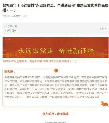 马钢交材“永远跟党走,奋进新征程”主题征文活动圆满结束,此次活动经过支部推荐、内部评审等环节,评选出一、二、三等奖及鼓励奖共9篇。优秀征文作品在马钢交材官微集中推送发布。通过活动的开展,引导广大职工听党话、跟党走,建功“十四五”、奋进新征程。获奖征文作品叙述身边的喜人变化,描写身边的先进典型,讴歌中国共产党100年来的伟大历程和丰功伟绩。作品内容贴合实际,体现了职工昂扬向上的精神风貌。