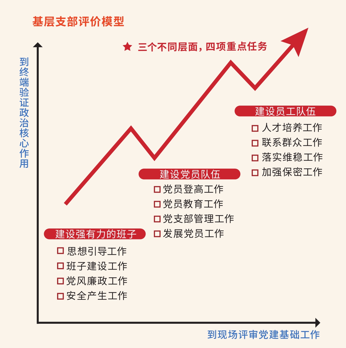 宝钢金属党委借鉴ISO9001体系的运作机制,将中国宝武《关于进一步加强和改进党支部建设的意见》对支部工作的要求解读成一条条标准,同时借鉴现场评审的机制,建立支部工作贯标机制。针对基层党支部三项重点工作,加强基层领导班子和基层管理者及骨干队伍建设、加强党员队伍建设、加强员工队伍建设,梳理出12项关键任务,分别设立目标,同时明确相应的要求、指导文件、规范和准则,以形成评审的指标和模型。