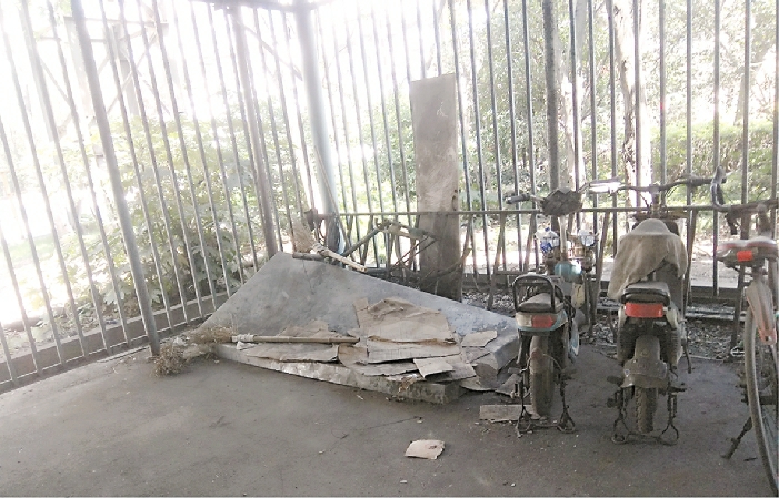 自行车棚内放置着废弃物品、停用食堂内堆放大量垃圾、断损路牌无人修理……这是员工近日拍到的情况。