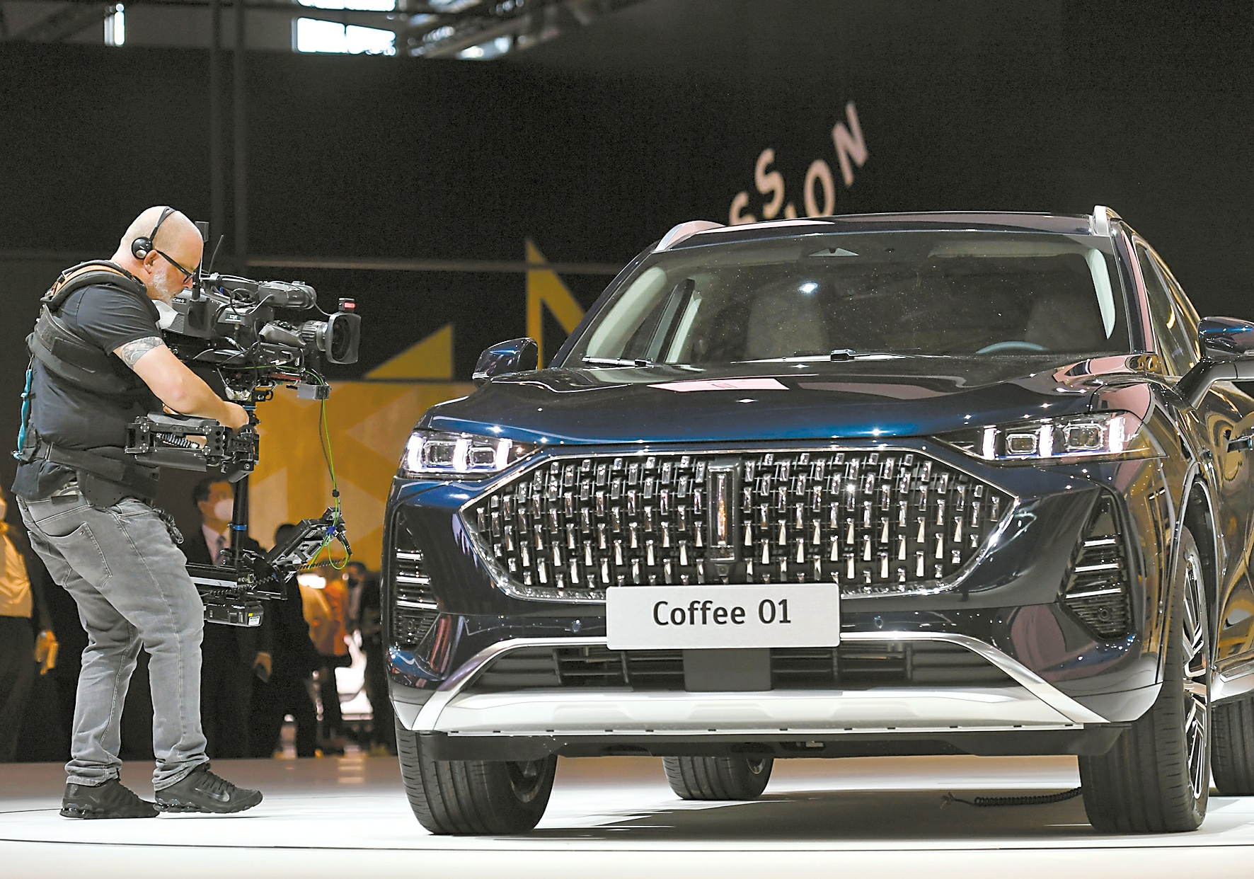 中国长城汽车旗下魏牌摩卡(Coffee01)PHEV车型日前在德国国际汽车及智慧出行博览会上全球首发,向欧洲观众揭开面纱。该车型纯电续航里程超过150千米,新车预计今年底开始接受预订,2022年上半年首批陆续交付。图为博览会上展示的魏牌摩卡PHEV车型。 新华社供图
