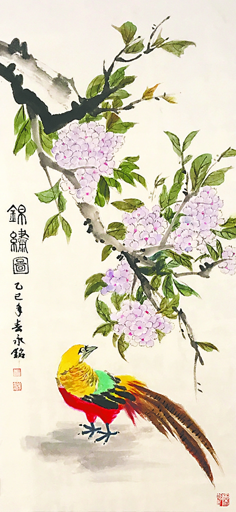 禽鸟抓形到位,绣球花用笔传神
