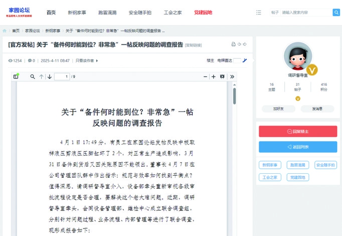 4月1日17:49,一条题目为《备件何时能到位?非常急》的帖子在新钢家园论坛引发热议。帖子内容主要是关于中板取样液压剪故障及备件领取受阻。新钢党委书记、董事长刘建荣关注到后第一时间安排联合调查,要求重新审视审批流程,破解规范与效率的平衡难题。4月10日,调研督导室在公司办公系统向全体干部职工公布调查结果。
