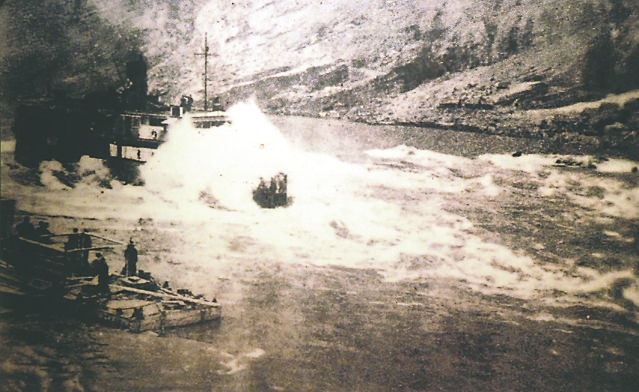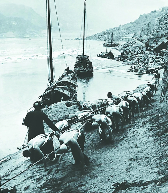 ▲运载工厂器材的小船在川江上艰难跋涉