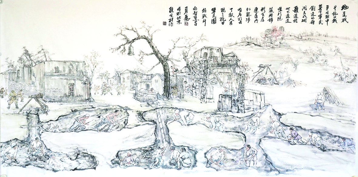 纵横交错的地道,粗犷的墨线与重叠的灰面,让“军民一心”四个字在幽暗中发出光。
