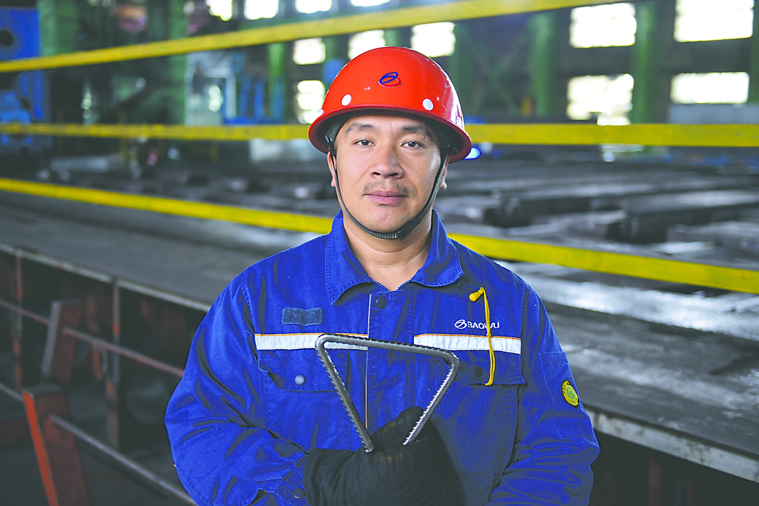 七月的天山脚下,八钢公司轧钢厂小型作业区的厂房里,热浪裹着轧机的轰鸣和红条的穿梭。12米长的冷床旁,艾山江·吾布力卡斯木身体微微前倾、目光如炬--又一批25毫米直径的螺纹钢“唰”地滑过。他迅速抬手,精准地将一根长度不足的“短尺材”挑出三段链双排车。汗水钻出安全帽带滑向下巴,后背藏蓝色工装早已被汗水反复浸透,结出一层叠着一层的白碱。这抹藏在高温厂房里的“盐花”,浸染着这位维吾尔族职工从“绿化管道维修工”到“轧钢冷床挑钢工”的蜕变故事。