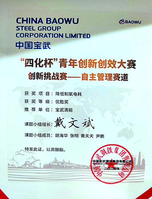 凭借着这份坚持与协作,我们的课题一路过关斩将,取得了优异的成效:2024年制氧电耗平均值为0.460千瓦时/立方米,改善明显,实现为公司创效。并且在集团举办的“四化杯”青年创新创效大赛创新挑战赛自主管理赛道荣获优胜奖。获奖的那一刻,我无比自豪,也深知这份荣誉背后,是无数个日夜付出的结果。