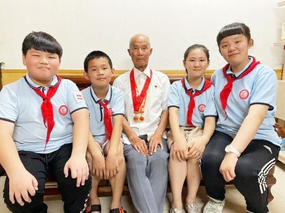队员们有幸见到了这位老革命战士--89岁高龄的高允义爷爷。队员给高爷爷献上美丽的鲜花和鲜艳的红领巾,表达少先队员最崇高的敬意。
