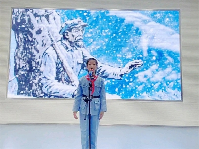 五(16)班韩妙昕在舞台上情感充沛、台风稳健、收放自如。通过真挚的感情、形象生动的肢体动作,饱含深情地讲述了《军礼》这个感人的故事。她落落大方的舞台举止、恰到好处的情感表达、打动了观众,征服了评委和现场观众。