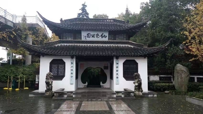 来到公园门口,有一道用深红色的石头建成的门楼,上面雕刻着龙,浑厚古朴。门楼上面写着“仙女公园”四个大字。