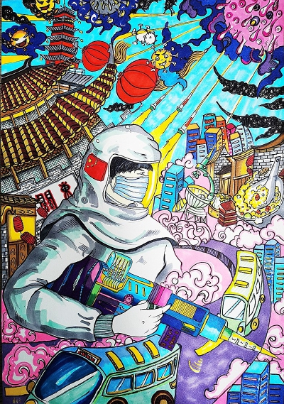 画面中,一位手拿疫苗枪的白衣战士正在与病毒作战映入我们的眼帘。无论身旁的病毒多么凶残、多么肆虐,他依然目光坚定、毫不畏惧,用自己的臂膀捍卫着自己的家园。他身处以粉红云朵和蔚蓝天空为主色调的环境中,仿佛有无数温暖的力量支撑着、鼓舞着……强烈的冷暖对比、流畅的黑白线条,在视觉的冲击中让我们深深地感受到人人团结一心,春暖花开。其次,以东关街、平山堂、城市街道、蛋炒饭等扬州最具特色的建筑和美食为背景进行渲染,让我们坚信,风雨过后一定会有“彩虹”。扬州加油!