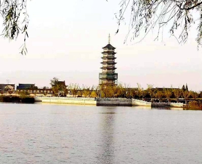 我站在若虚文化中心的亲水平台上向远方看去,开元寺的银杏树隐约可见,宝塔高耸入云。芦苇被风儿吹得起起伏伏,像一层层金色的波浪,荡漾着。小鱼在波光粼粼的湖面上吐出一个泡泡,又摆尾而去,水面绽开一个个圆圈……