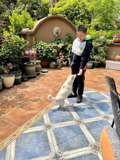 “白白”喜欢吃肉、骨头、狗粮。一次,我拿着一块肉逗它。它仰着小脑袋,围着我转来转去,不停地叫。每次我把肉往空中一抛,他都能迅捷、精准地张大嘴巴,跃至空中,迎向那块肉。待叼住肉,它就迅速转移到干净的地方,前爪按住肉,用牙齿把肉一点一点撕下来,吃得津津有味。吃完了,它会用舌头舔舔前爪,舔舔嘴巴,意犹未尽的样子,仿佛在说:“嗯,真美味!”