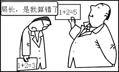 在一个办公室里,一名员工拿着牌子,上面写着“1+2=3”,可是局长手中的牌子上却写着“1+2=5”,那名员工耷拉着脑袋,低声地道歉道:“对不起,局长,我算错了……”