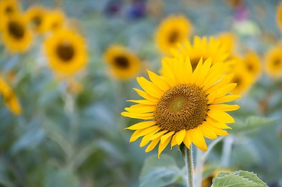 公园前的田地里,在金色阳光照耀下,一大片向日葵在风中翩翩起舞。它们有节奏地摇晃起来,远远望去就像金色的浪潮扑面而来。“沙沙、沙沙”,那声音真是悦耳动听。花盘上,乌黑的葵花籽布满了向日葵的花心,黄黄的半圆形花瓣绕着花心,很均匀地分布着,昂首向着太阳微笑。