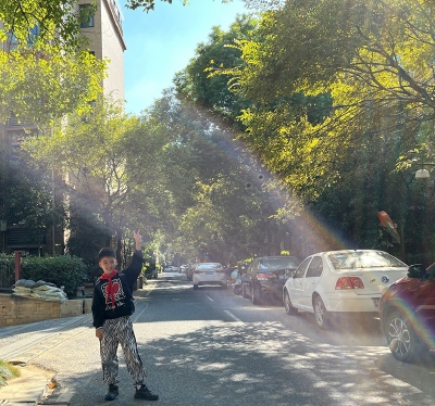 出了门,映入我眼帘的是一条宽阔的大道,大道两旁是一棵棵枝繁叶茂的大树,那一片片翠绿的树叶在阳光的照耀下,显得更加的生机勃勃。一阵微风拂过,树叶“沙沙”作响,树上的鸟儿仿佛受到了惊吓,“叽叽喳喳”喧闹起来。大树下那一朵朵五颜六色的鲜花,像是“优雅的女士”躲在遮阳伞下喝着咖啡、聊着天,不时露出笑脸。瞧!蝴蝶和蜜蜂也被它们吸引了,正围着它们飞舞呢!