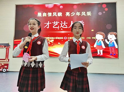 六(19)班汤曦同学:前些日子,我和我的搭档汪黎宇参加了校园“才艺达人秀”第六期表演。虽说已经不是第一次登台,可我还是莫名有些紧张。当我深吸一口气,跟着搭档,迈着自信的步伐走上舞台。我一开口就逗得台下观众哈哈大笑。想不到效果这么好,我慢慢放松了自己。在接近尾声时,我和搭档趁热打铁,表演了一段快板,台下的掌声经久不息。表演相当成功!因为我战胜了胆怯,战胜了紧张,变得更加自信!