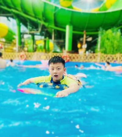接下来,我们又开启漂流探险之旅。漂流水道细长狭窄,正当我随着水道左右摇摆时,突然一阵“倾盆大雨”落在我头上,眼前立刻模糊不清。等我定睛一看,原来前方有个巨大的龙头,正在不停地喷着水呢。第二次我便提高警惕,头一低背一弓,把救生衣当护甲,顺利通过!此时泳池里荡起层层波浪,像是为我鼓掌欢呼!