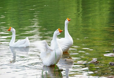 鹅,乡下人家总是要养几只的。它们身披白羽衣,红红的嘴巴和脚蹼,走起路来大摇大摆,神气极了!它们时而嬉戏,双脚划水,扑扇翅膀,表演水上芭蕾;时而伸长脖子高歌一曲,“鹅鹅鹅,曲项向天歌”;时而在绿丝绒般的草地上玩耍觅食,你追我赶;时而支棱着翅膀,昂首挺胸,不可一世地在岸边走着。