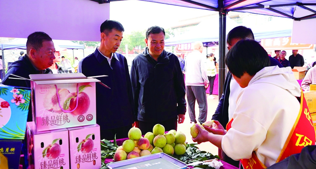 钟楼广场两侧的农产品展销区内人声鼎沸,一个个展位整齐排列,琳琅满目的特色农产品摆放得满满当当,吸引着群众驻足咨询、选购。