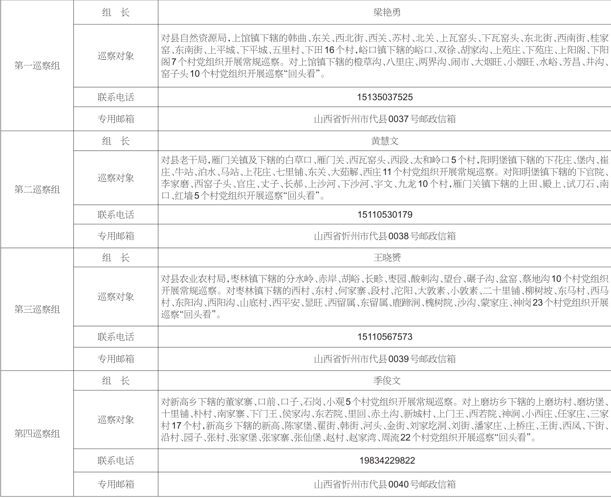 本报讯 根据县委统一部署,截止3月31日,十五届县委第十轮巡察完成进驻工作。四个巡察组将对雁门关镇、县委老干局、县农业农村局、县自然资源局4个单位党组织和54个农村党组织开展常规巡察,对87个农村党组织进行巡察“回头看”。
