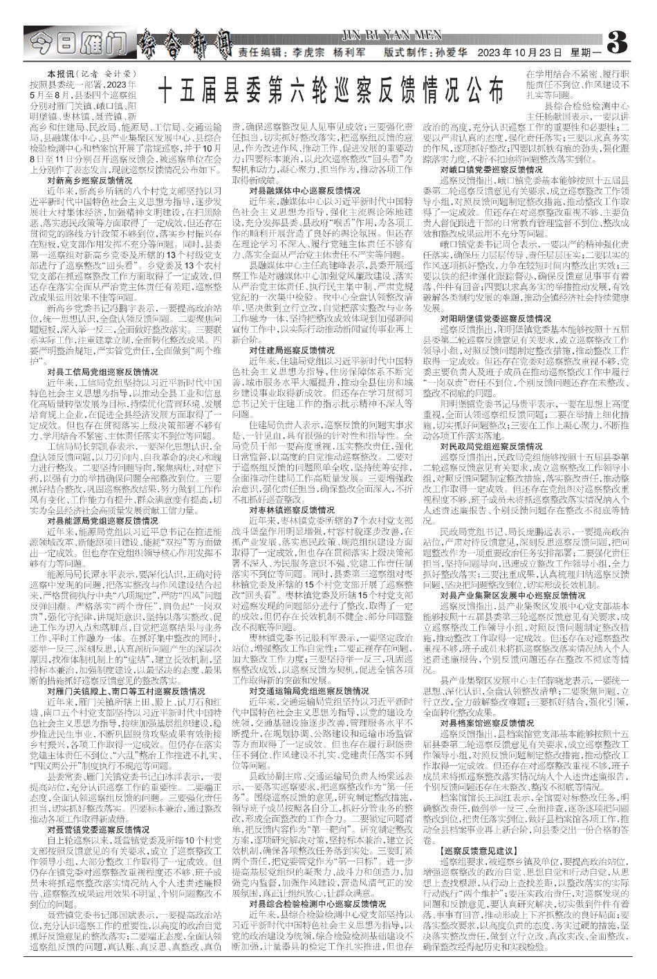 十五届县委第六轮巡察反馈情况公布