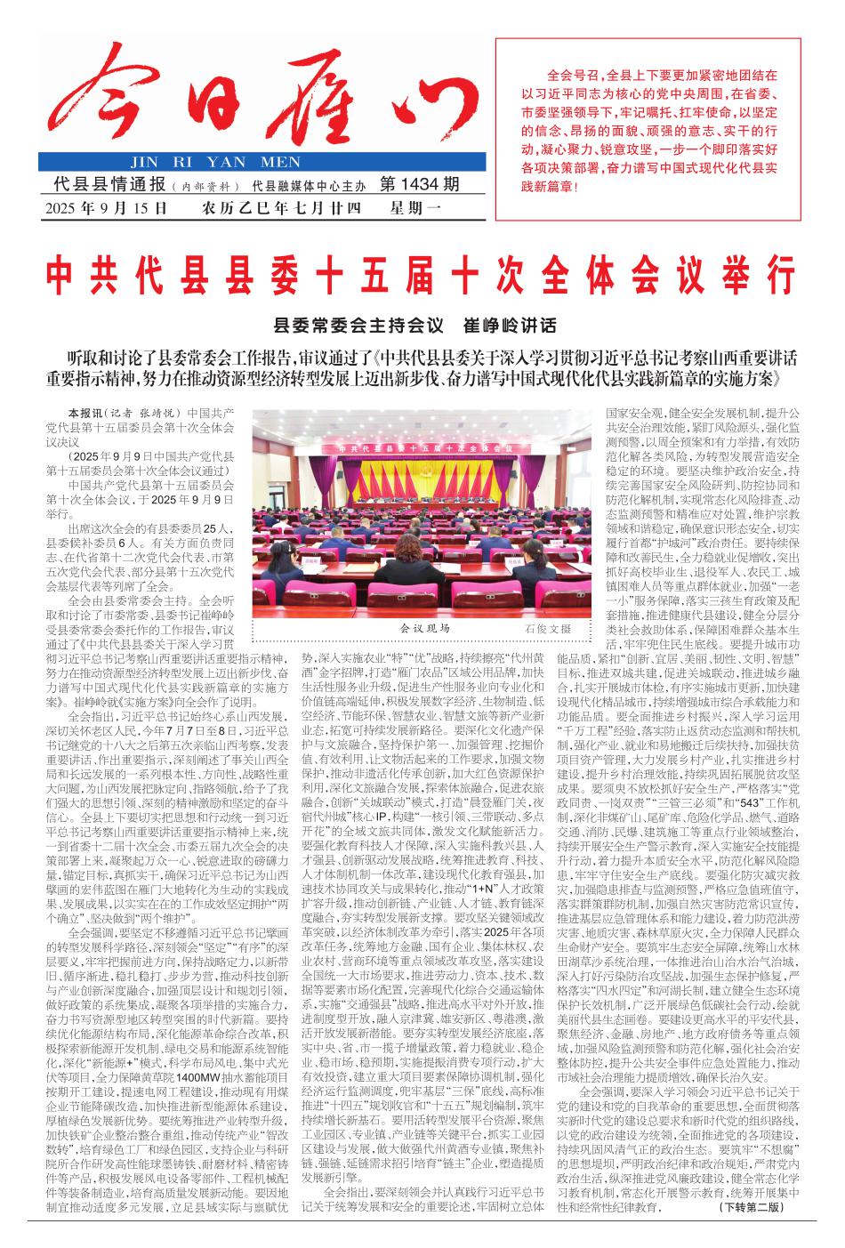 中共代县县委十五届十次全体会议举行