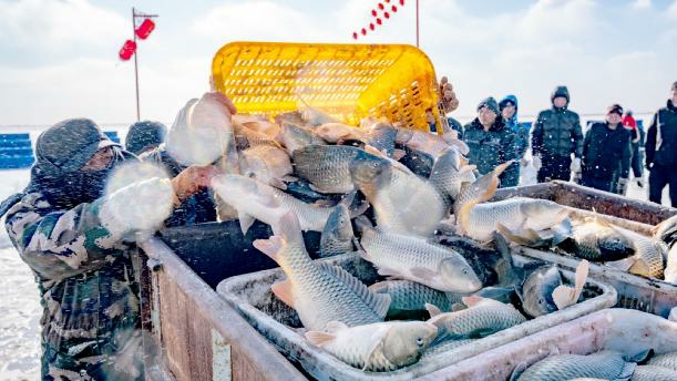 在呼和浩特哈素海第四届冬捕节上,渔民们把鱼装车。