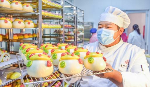 1月13日,在山东省胶州市九龙街道,黑氏传统花馍非遗工坊店主黑尤坤将花馍从货架上取下。