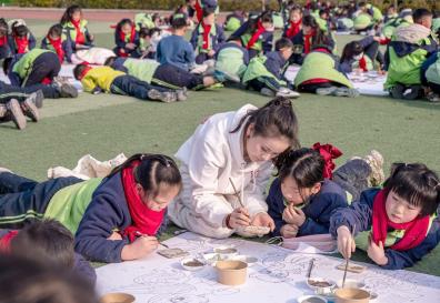 1月14日,四川省自贡市荣县树人小学校操场上,千余名师生共同在巨型“马”字轮廓的画布上创作,以纸绘、陶板绘等形式画出各式生肖马。