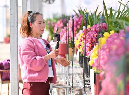 1月15日,在位于周宁县七步镇的鸿腾农业开发有限公司花卉大棚内,工作人员在电商直播大花惠兰盆栽。