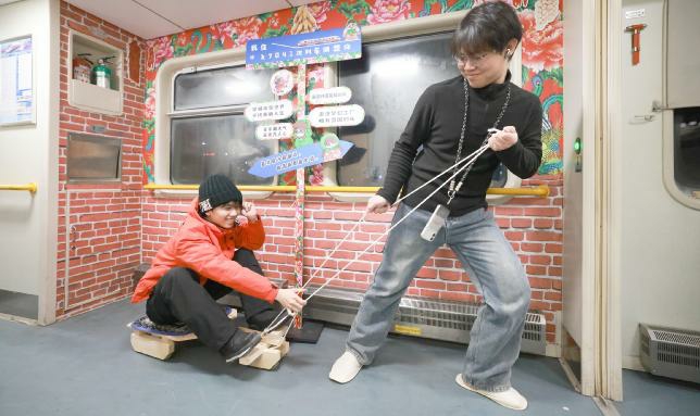 1月19日,来自马来西亚的游客在K7041次“东北民俗”主题列车上体验“三角爬犁”。