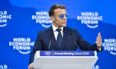 1月20日,法国总统马克龙在瑞士达沃斯举办的世界经济论坛2026年年会上讲话。