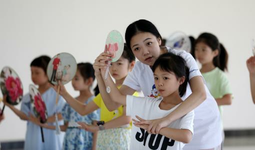 7月31日,在湖南省昆剧团教室,演员指导孩子学习昆曲动作。