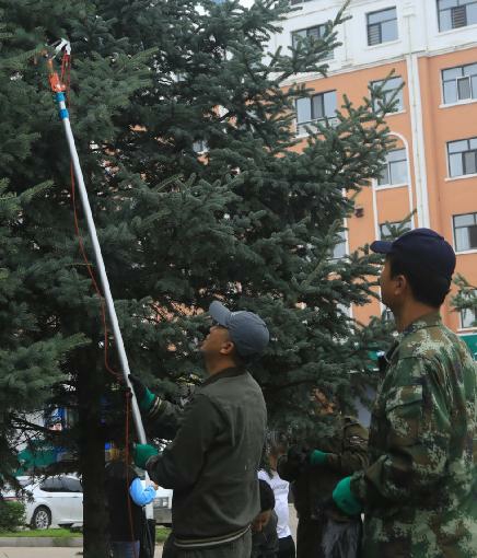 7月27日,绰尔森工公司森防站工作人员采取人工摘除的方法,摘除公司所在地中央街及其他道路两侧云杉树上的虫瘿,确保树木健康生长。