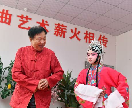 8月28日,在河北省青县“哈哈腔”传承示范基地,非遗传承人刘宗发给小学员说戏。暑假期间,在河北省青县木门店镇“哈哈腔”传承示范基地,小学员们在老艺人的带领下学习“哈哈腔”,度过充实的假期。“哈哈腔”是一种地方戏曲,2006年被列入国家级非物质文化遗产名录。新华社发(苑立伟 摄)