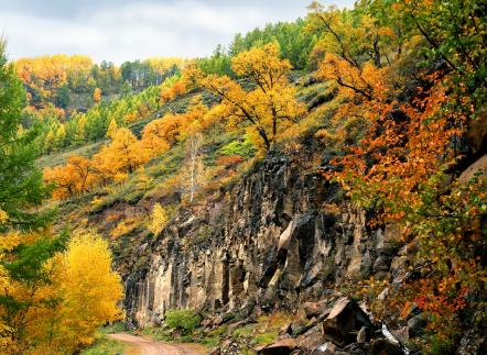 老雕窝位于河中林场51林班27小班。在海拔1280米的悬雀峭壁上,有一处直径约1.4米的天然圆形石穴,因曾有金雕在此停留觅食,故得名为“老雕窝”。这里峭壁嶙峋,其上零星点缀着落叶松和白桦,壁底高大的钻天柳林及湍流而过的莫柯河,为金雕故里增添了几分幽静和神秘。