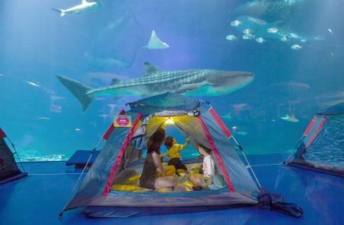 8月27日,体验者在珠海长隆海洋王国鲸鲨馆搭帐篷夜宿,在鲸鲨保育专家的科普中增长知识,近距离体验与鲸鲨等海洋生物同眠的奇妙之夜,感受人与自然和谐相处,传递生态保护理念。