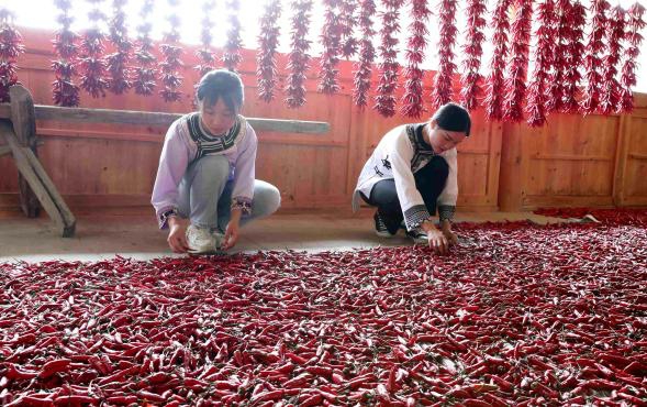 9月1日,在贵州省榕江县平阳乡硐里村,村民在晾晒朝天椒。